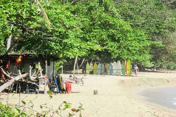 A narrow-paved coast road parallels the beach, running through the jungle, with dirt and gravel roads leading off to beaches, many of which are usually empty, save for a few families gathered under the shade of the trees, often with hammocks hung for afternoon naps.