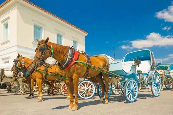 Spetses is known for being a “car-free” island meaning that while there are a few taxis available for hire, most private automobiles are not allowed to drive within the city limits. This adds to the charm of the island as visitors walk, ride bicycles, take horse-drawn carriages, or use scooters or motorcycles.