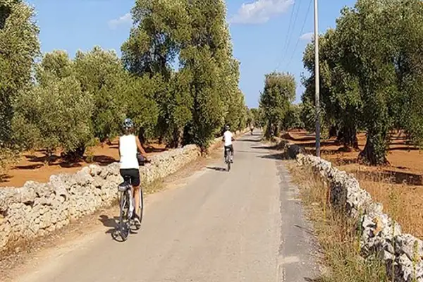 We joined locals making their way to work through Ostuni on Monday morning as we set out on about a 10-mile ride to the train station at Carovigno. We were quickly out of the village and on a downhill run through olive groves being prepared for the harvest.
